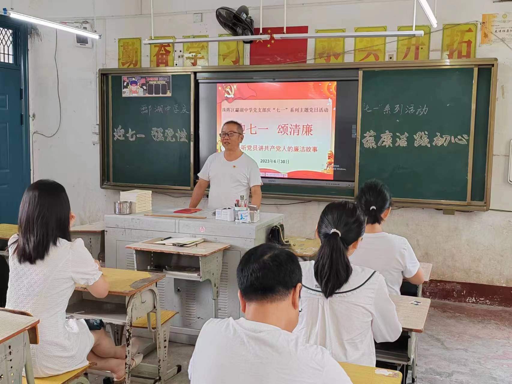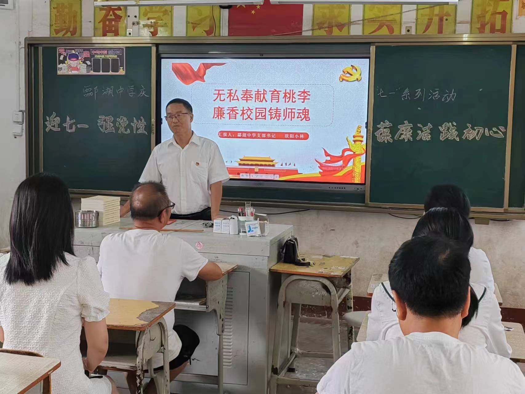 围绕"迎七一 强党性 葆廉洁 践初心"这一主题,结合"一月一课一片一实践"主题党日活动,党支部书记欧阳小林同志为全体党员教师上了一堂以"无私奉献育桃李,廉香校园铸师魂"为题的廉政党课。党课结束后,大家观看了教育片《清官彭玉麟》,并聆听老党员祝雄同志讲共产党人的廉洁故事,让全体党员教师接受了清风正气的洗礼,为深入推进清廉学校建设,创建清正廉明的校风夯实了思想基础。
