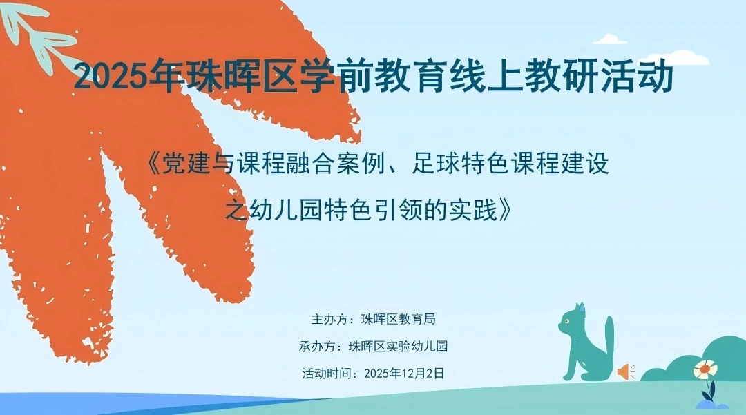12月2日,由珠晖区教育局主办、珠晖区实验幼儿园承办的"党建与课程融合案例、足球特色课程建设之幼儿园特色引领的实践"线上教研活动成功举行。活动通过腾讯会议直播,全区200余名公民办幼儿园园长、教师齐聚云端,共研共话学前教育高质量发展之路。