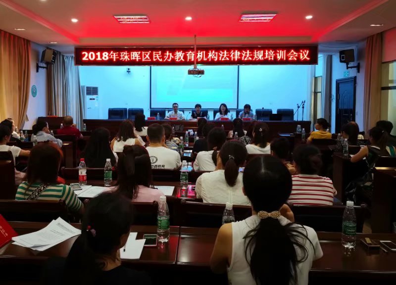 近日,2018年珠晖区民办教育协会法律法规培训在青少年校外活动中心隆重举行。区教文体局党委委员、主任督学刘辉,民管办、综治办负责人,民办教育协会会长、副会长、理事长以及全区民办教育机构董事长、校长、园长,共计80余人参加培训。