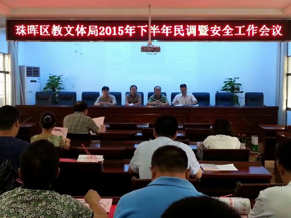 9月7日上午,珠晖区教育文化体育局召开2015年下半年民调暨安全工作会议,会议由局党委委员、副局长刘加意主持,局机关各股室站校馆办负责人和全区各中小学校分管综治安全工作的领导参加了会议。