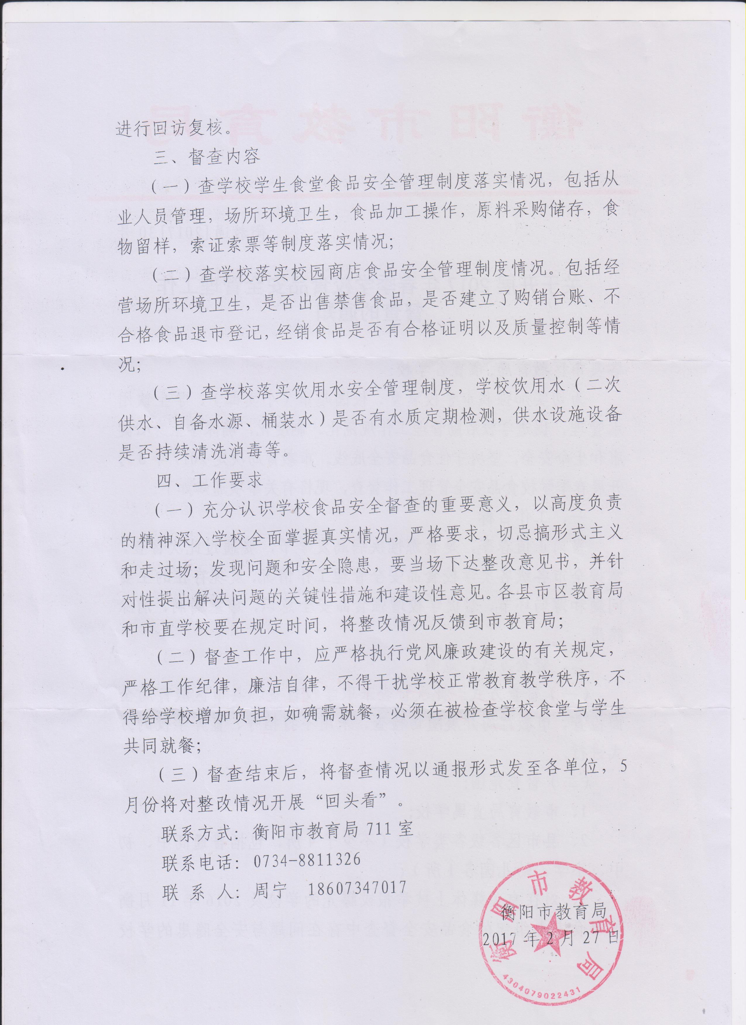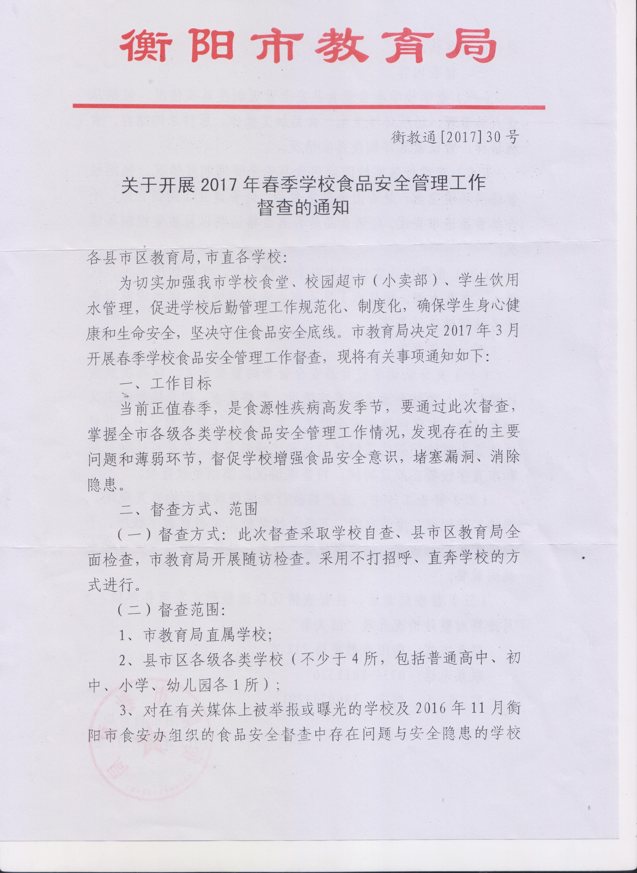 根据市教育局的要求,现将《关于开展2017年春季学校食品安全管理工作督查的通知》转发给你们,请遵照执行。