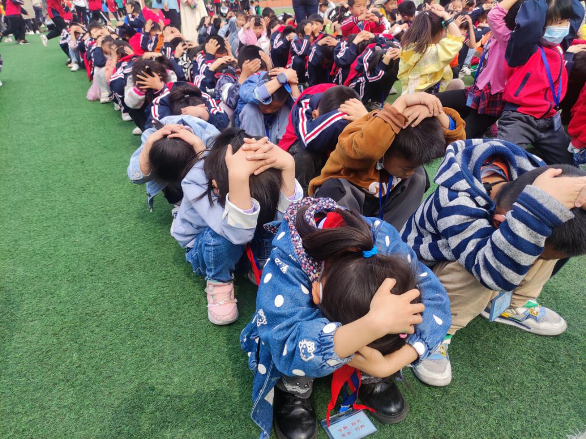 随着"应急警报"铃声的响起,演练开始。各年段负责人及各楼层值日老师第一时间迅速到岗,协助学生队伍快速、有序的撤离,各任课教师、班主任正确指导学生,都能按要求用书本或手护住头部,跟着队伍迅速撤离到安全的位置。之后刘秀平主席对第一次疏散演练情况做小结,并指出演练的不足和应该注意的地方。之后师生进入教室进行第二次演练,从逃离教室到安全区域时间较上次缩短35秒,全体师生安全到达指定地点。最后王校长对本次活动作出总结,同时教给了孩子们一些地震知识。