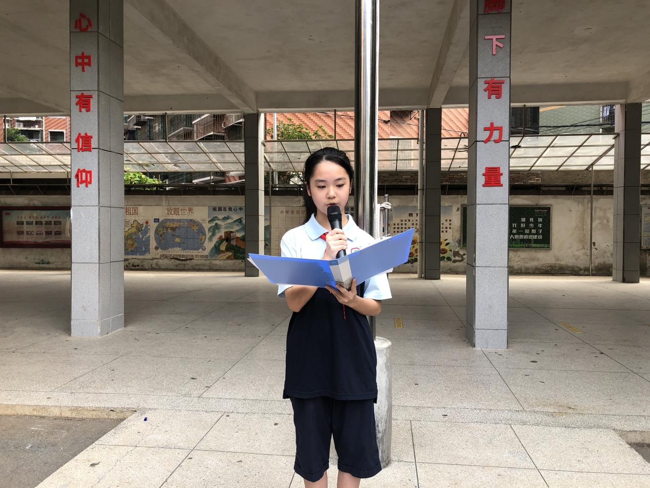 六年级五班的刘语涵同学作为学生代表上台,与同学们分享了自己的学习经验,她说学习没有捷径,在学习过程会经历许多磨难,我们要用坚强的意志去面对困难,敢于解决问题。要以革命先烈和时代英雄们为榜样,践行社会主义核心价值观,争做新时代的好少年,做社会主义的建设者和接班人!