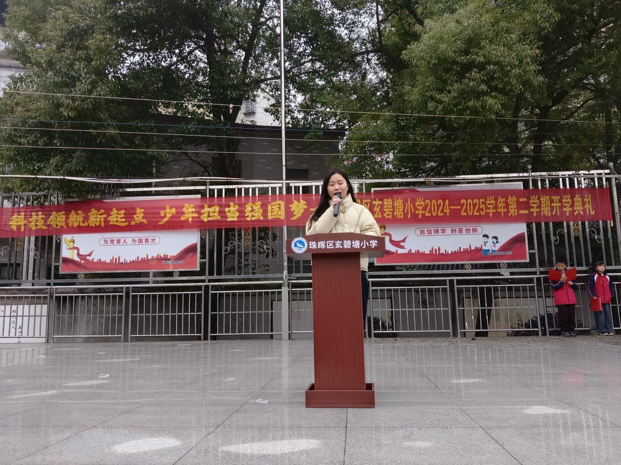 蛇年蜕变启新程,励志为帆逐浪行。又是一年开学季,为了激励全体师生明确目标、振奋精神、砥砺前行,2月24日上午,珠晖区玄碧塘小学举行了2025年春季学期开学典礼。开学典礼由大队部干部谢曦叶、杨王晴主持。