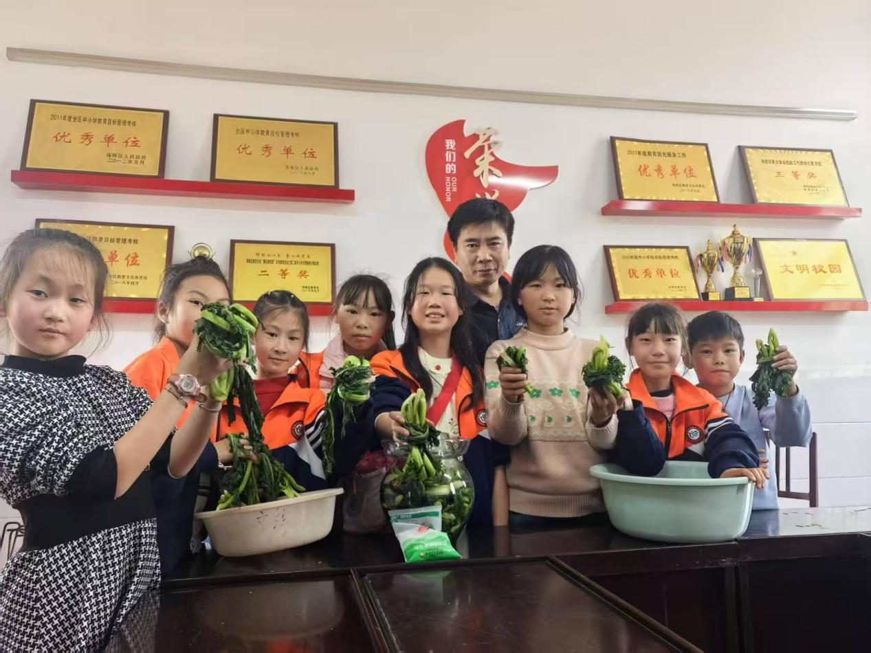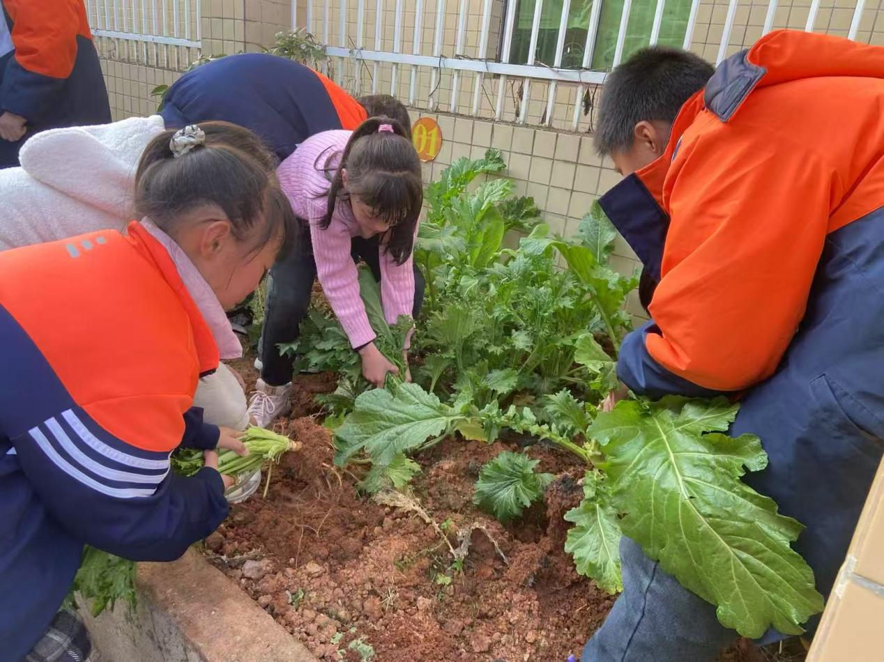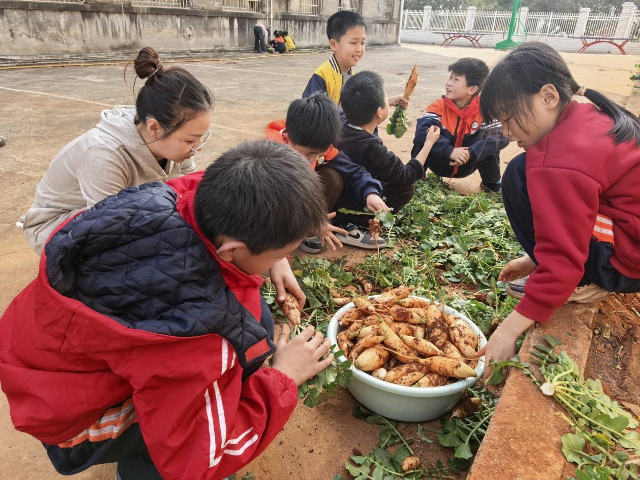 近日春意盎然,建湘小学劳动实践基地内一片欢腾。在师生的共同呵护下,菜园里的萝卜、青菜等蔬菜急需采摘收获了,学校教导处决定组织学生过一个简单的收获节。收获节分高低年级协作,低年级学生拔萝卜,高年级学生收青菜,并开展腌咸菜、做酸萝卜的实践体验活动,让劳动教育在亲近自然动手实践中焕发活力。