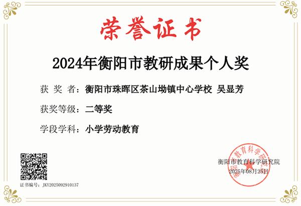 日前,衡阳市教育科学研究院公布了2024年衡阳市教研成果评选结果,珠晖区茶山坳镇中心学校吴显芳老师主持申报的小学劳动教育研究成果斩获衡阳市教研成果个人奖二等奖,为学校劳动教育领域再添荣誉。