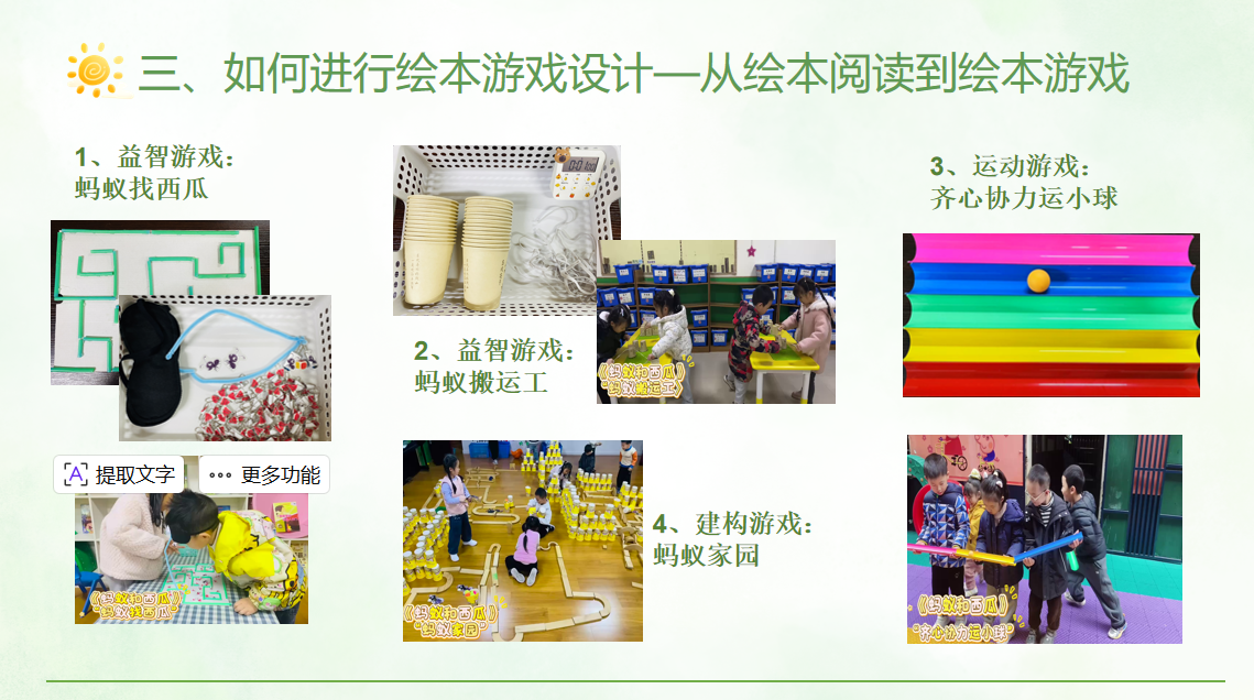 本次研讨的核心聚焦于绘本游戏设计方法与路径。分享中明确,可从绘本主题、情节、人物、图画等多元素切入,遵循"研读绘本—设计阅读活动—生成游戏—优化深化"四步流程推进游戏设计。通过"蚂蚁搬运工""蚂蚁家园"等具体游戏案例,直观呈现了益智、建构等不同类型绘本游戏的设计思路,并针对绘本资源运用中常见的问题,也给出了配置优