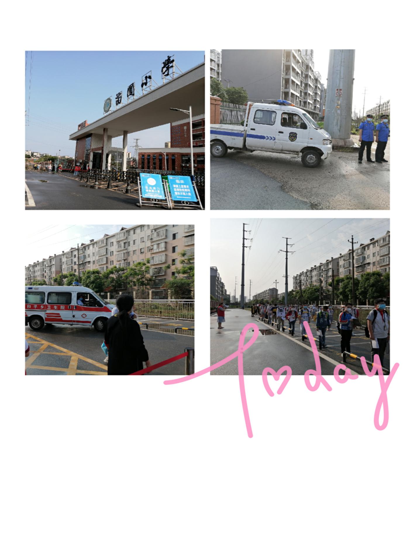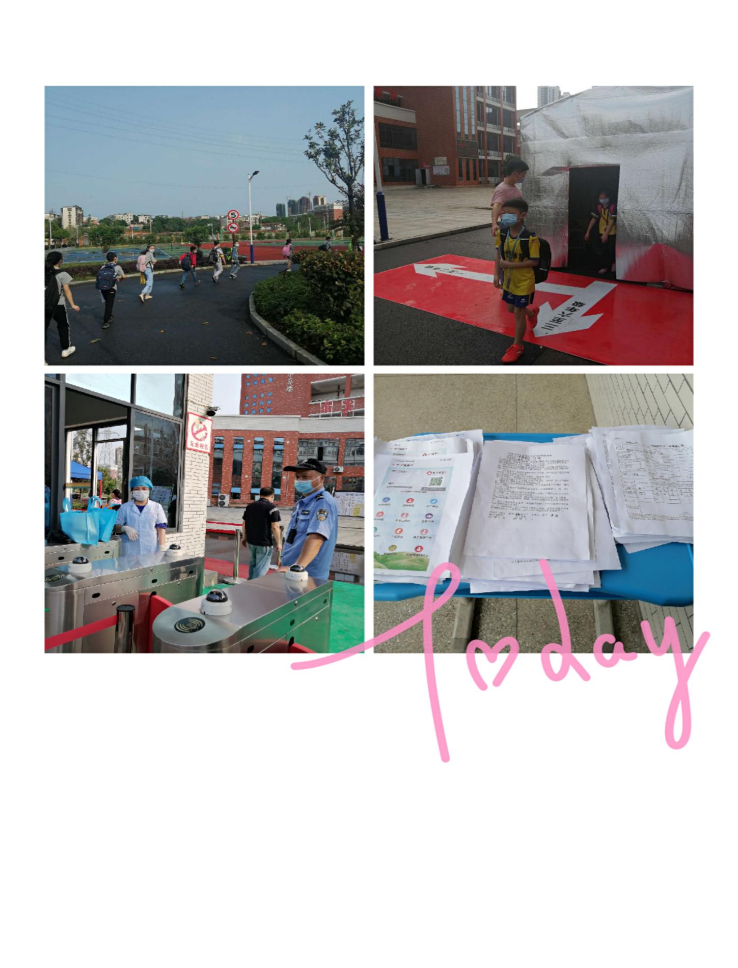 "请拿好自己的健康登记卡!""请保持1米距离排队依次进入校园!""请家长不要进入校园!"穿着红马褂的值班教师正在从容地引导师生们从学校的三个电子测温仪通道依次有序地进入校园。校园周边,珠晖区城管的叔叔们正在指挥车辆绕行,非师生免入。