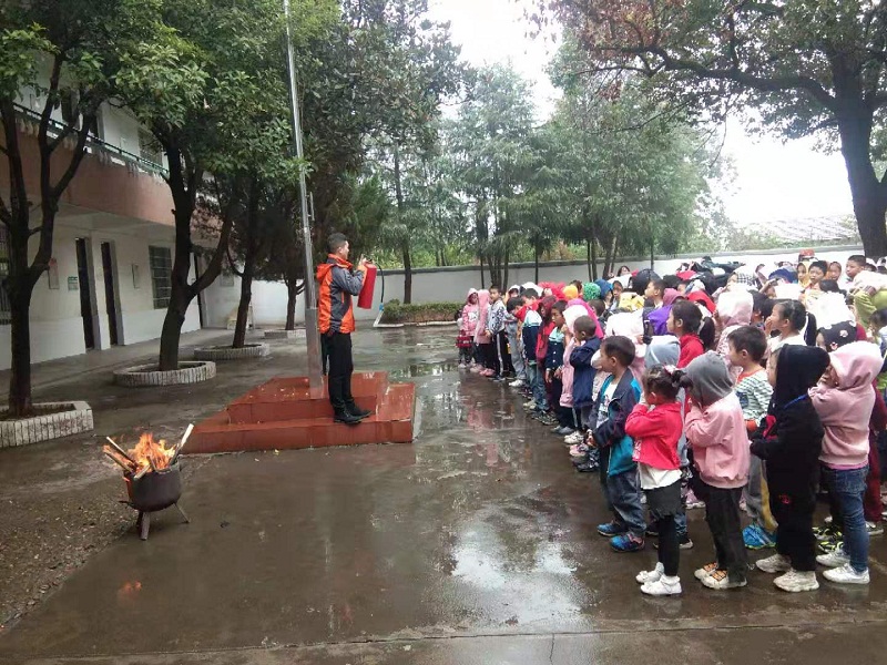 下午2点30分,学校教学楼楼梯口浓烟弥漫,急促的警报声响起,全体学生在老师的组织和指挥下,捂住口鼻,弯着腰有序撤离教室,在操场集合。之后,来自湖南省消防协会的李警官结合学生的日常生活,从家庭用电、灭火器的使用、发生火灾时的自救等方面向全体师生讲述消防知识。最后,李警官还给大家演示灭火器的使用方法,学生也学会了灭火器的使用。