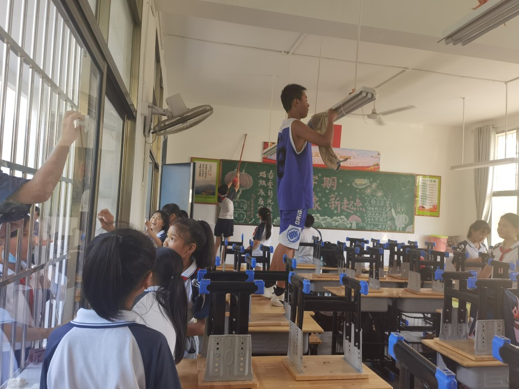 本次大扫除,对校园室内外进行全方位、无死角的彻底清扫。下午第一节课铃声一响,同学们走出教室,走进校园,就开始了热火朝天的“劳动”。除灰、去尘、擦窗、拖地、物品重新摆放……师生们人人动手,积极合作,不怕脏、不怕累,忙得不亦乐乎。在全体师生的努力下,各班窗明几净,焕然一新,校园环境得到明显改善。