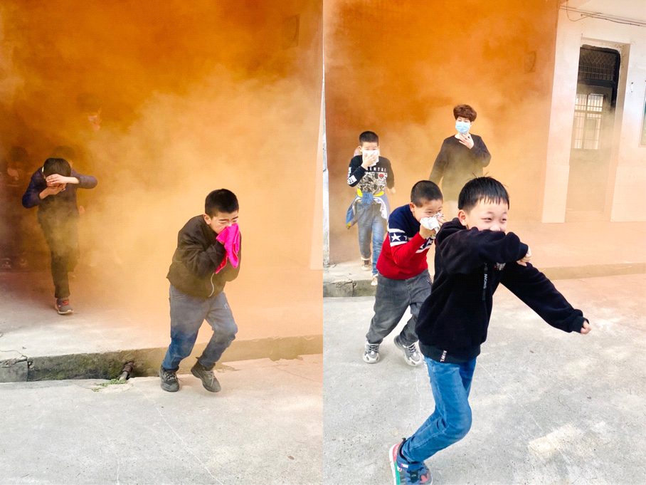 伴随紧急响起的警报声,演练正式开始。在浓烈的烟雾中,学生们在老师的指挥下用帕子捂住口鼻,弯腰低头,快速有序在班级门口排成纵队并撤离至学校操场安全区域,整个演练过程井然有序。