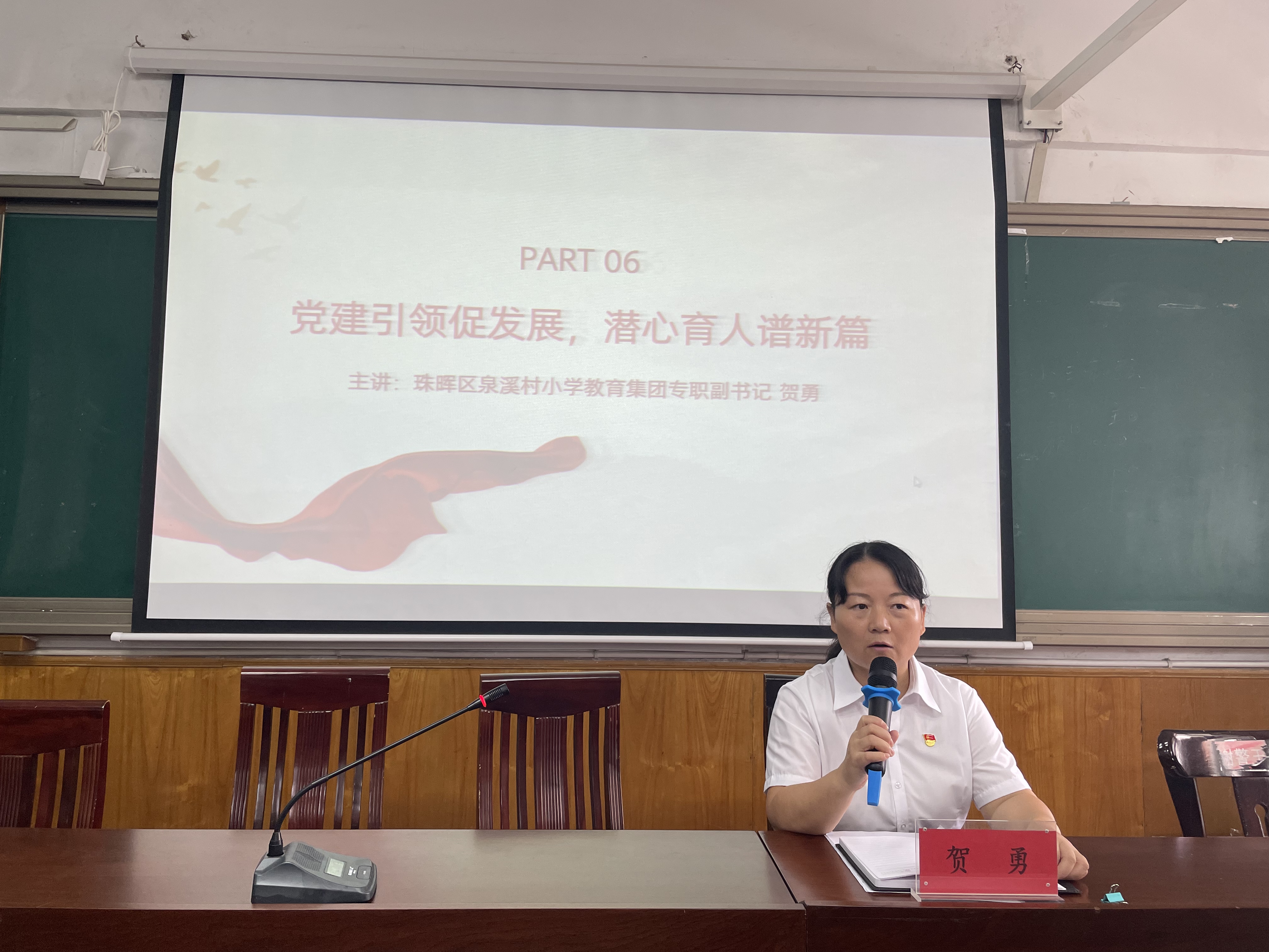 珠晖区泉溪村小学教育集团始终坚持党建引领,集团校总支专职副书记发表了以《党建引领促发展,潜心育人谱新篇》为题的讲话,贺书记表示要突出政治引领,高度重视党员和教职工思想政治教育;狠抓党风廉政建设,全面打造清廉学校;强化师德师风建设,锻造高素质教师队伍,积极推动党建工作与教育教学工作深度融合,努力办好让人民满意的教育。