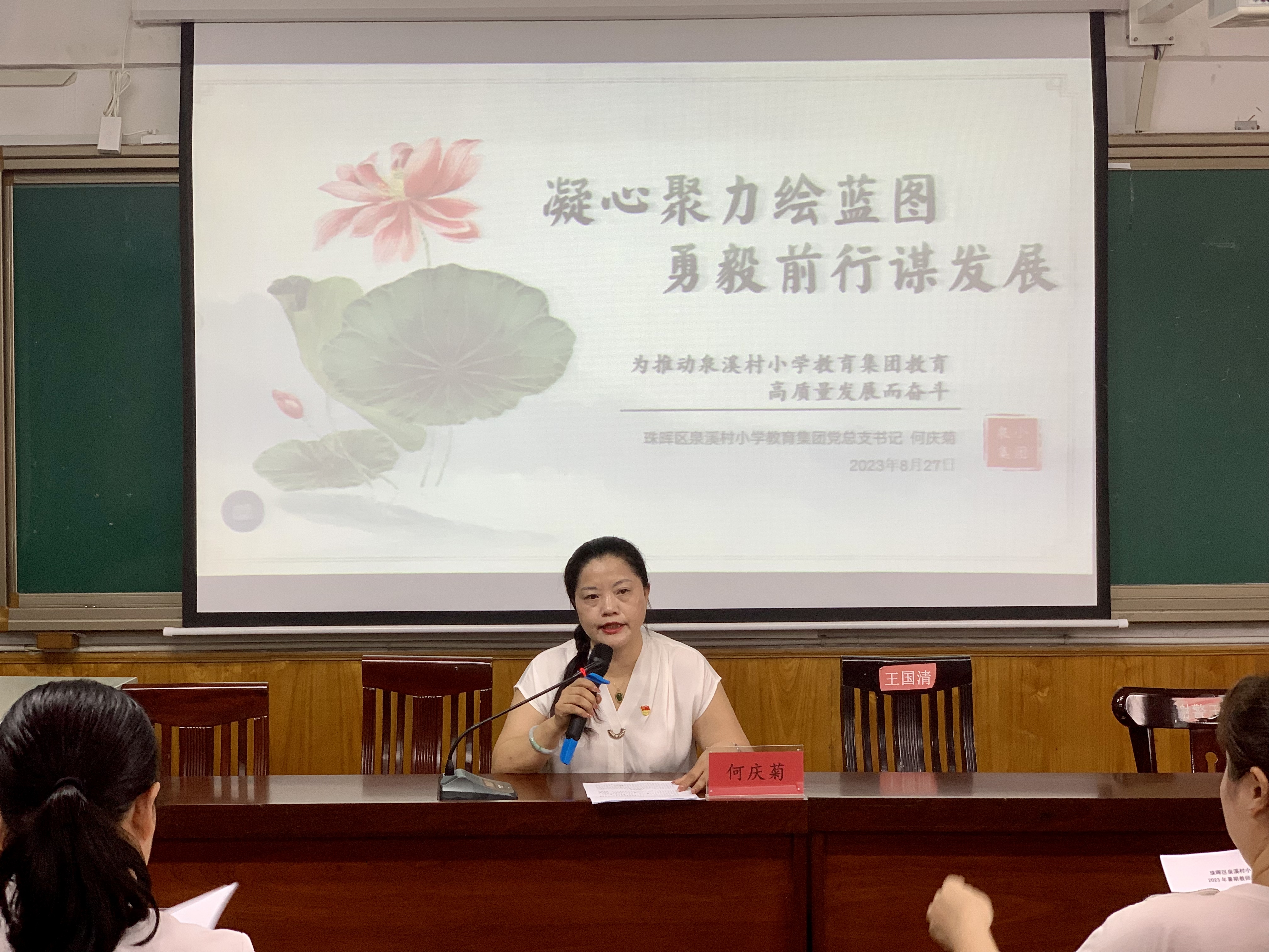 培训会上,珠晖区泉溪村小学教育集团党总支书记作了以《凝心聚力绘蓝图,勇毅前行谋发展》为主题的培训动员报告,带领全体教师回望过去取得的辉煌成绩,立足现在分析集团校的办学现状、三个校区的校情,未来致力于打造集团校品牌办学特色。何书记希望全体教职工立足本职工作,时刻保持忧患意识,不断提升业务能力水平,以美育人、以文化人,落实立德树人根本任务。