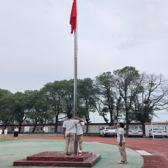 开学典礼在庄严的升旗仪式中拉开了序幕。在全体师生的注目礼下,英姿飒爽的国旗护卫队员进场,伴随着庄严的《中华人民共和国国歌》,五星红旗冉冉升起,迎风飘扬。