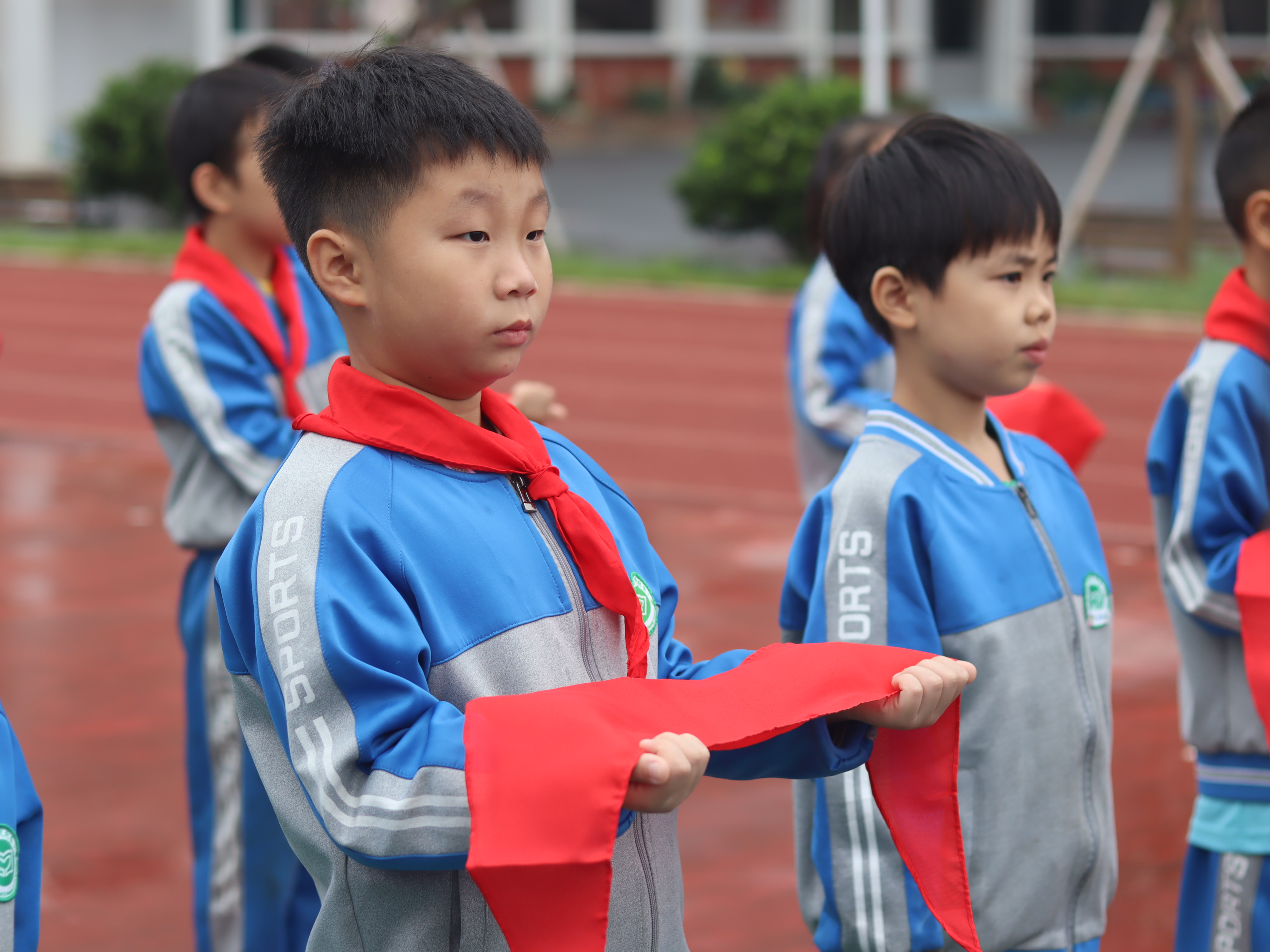 入队仪式上,高亢的少年先锋队队歌歌声响彻云霄,141名新队员昂首挺胸,由校领导和老队员为其佩戴红领巾。