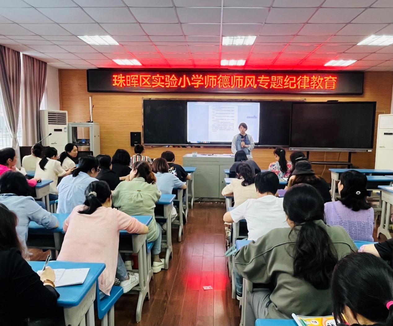 为进一步强化师德师风建设和加强清廉学校建设,提高教师职业道德修养,打造师德高尚、业务精良的风清气正教师队伍,2024年5月20日,珠晖区实验小学组织全体教师在多媒体教室开展师德师风专题纪律教育。