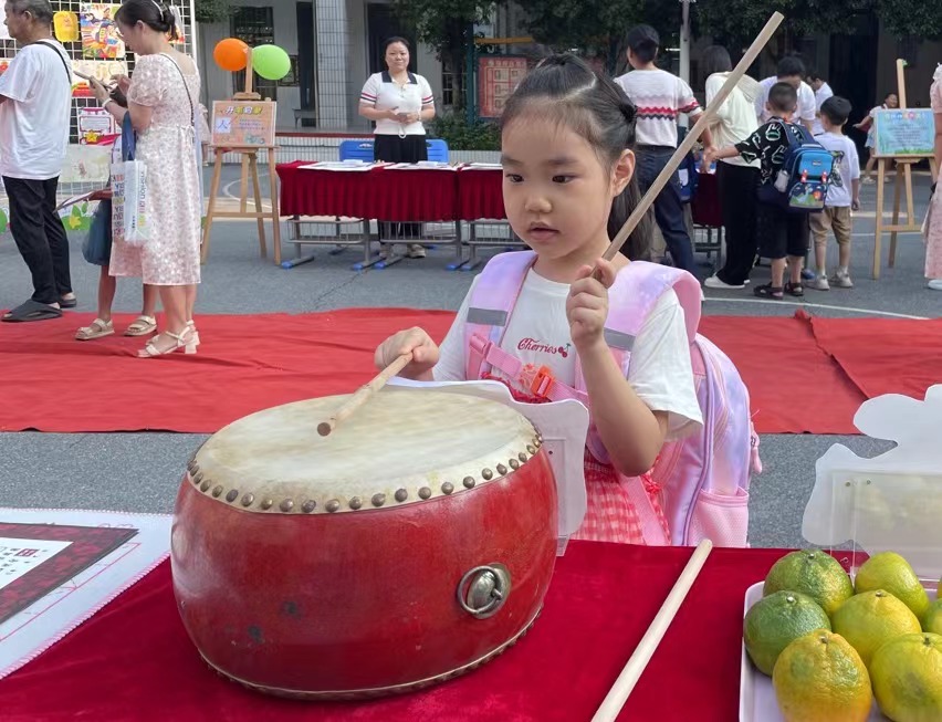 为了让新生们感受到学校的温暖与关怀,学校精心准备了一系列寓意吉祥的活动。进门后,孩子们摸摸苹果、橘子,寓意“平平安安、大吉大利”;碰碰大葱,寓意“聪明伶俐”;敲敲响鼓,寓意“一鼓作气”。这些传统仪式不仅让孩子们体验了文化的传承,更在懵懂与喜悦中收获了美好的祝福。