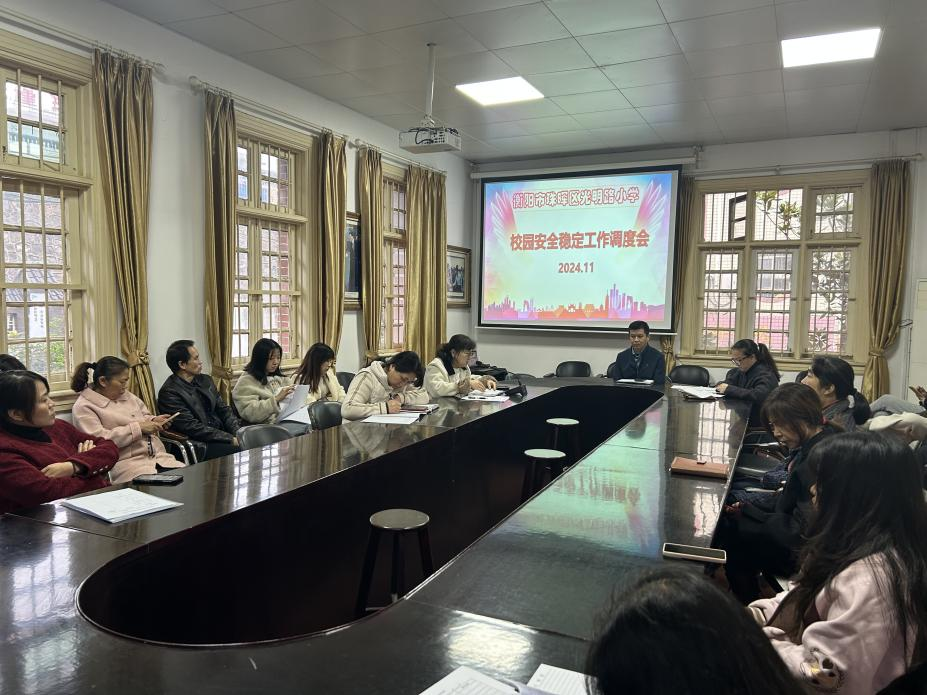 2024年11月19日中午,衡阳市珠晖区光明路小学召开“校园安全稳定工作调度”会议。宾杜副校长针对近期社会上发生的一些恶性事件进行通报,组织全体教师学习《关于开展衡阳市教育系统安全稳定风险和矛盾纠纷隐患排查的通知》。根据学校特点,确定了上下学安全管理、矛盾排查调解处理方式、应急管理、消防安全、用火用电安全、防欺凌教育等方面的排查重点。要求全体教师尽职尽责做好学生安全的守护者。