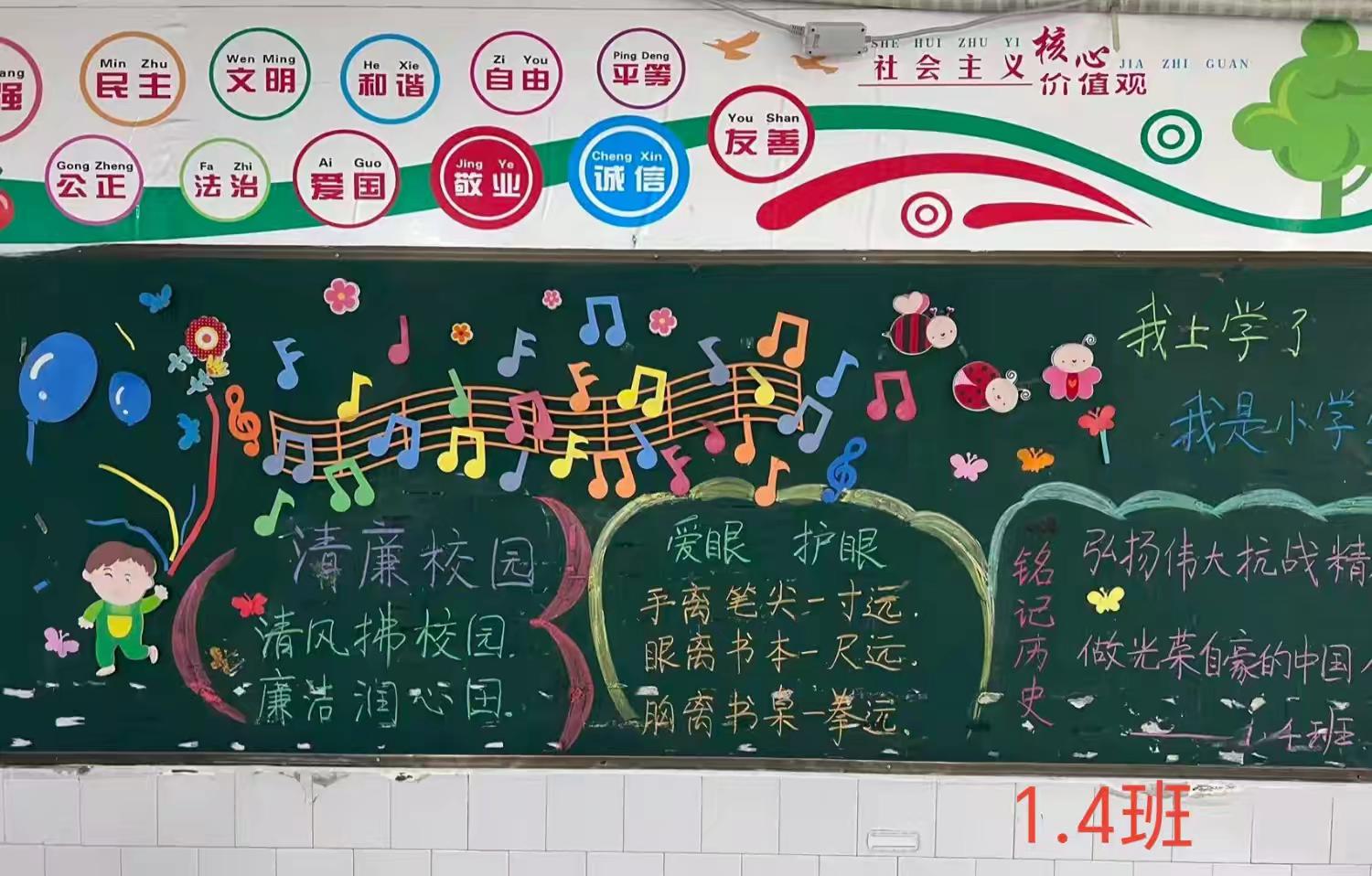 活动期间,各班师生充分发挥创意,精心设计每一个板块,认真书写每一段文字,仔细绘制每一幅插图。大家用手中的粉笔和画笔,将对抗日战争历史的铭记、对爱护卫生的倡导以及对清廉品质的弘扬,生动地呈现在黑板上。