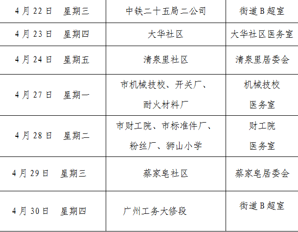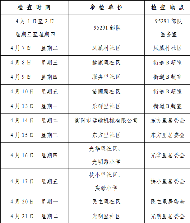 1、铁路印刷厂、衡铁公安处、衡铁法院、衡铁检察院、铁通、铁路职校、衡铁材料供应段、衡铁防疫站、衡阳市第二十三中学、中铁五局机械化公司、中地探矿机械厂等自检单位要求在5月1日前将应检、已检人员名单报送街道计生办。