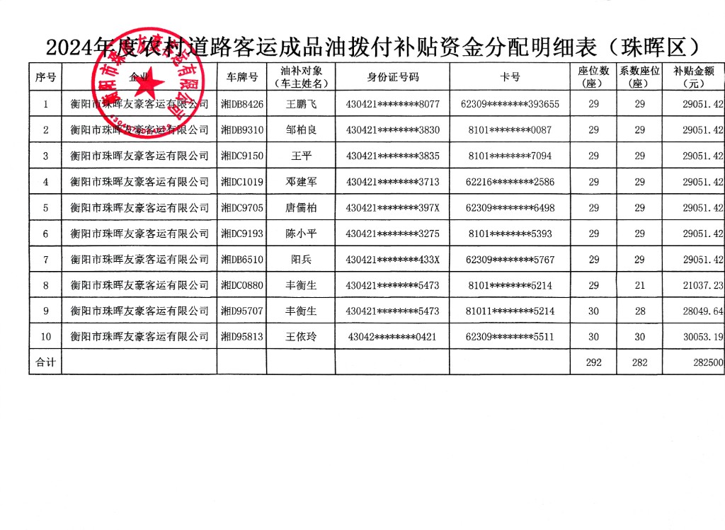 珠晖区2024年度农村道路客运费改税补贴资金公示