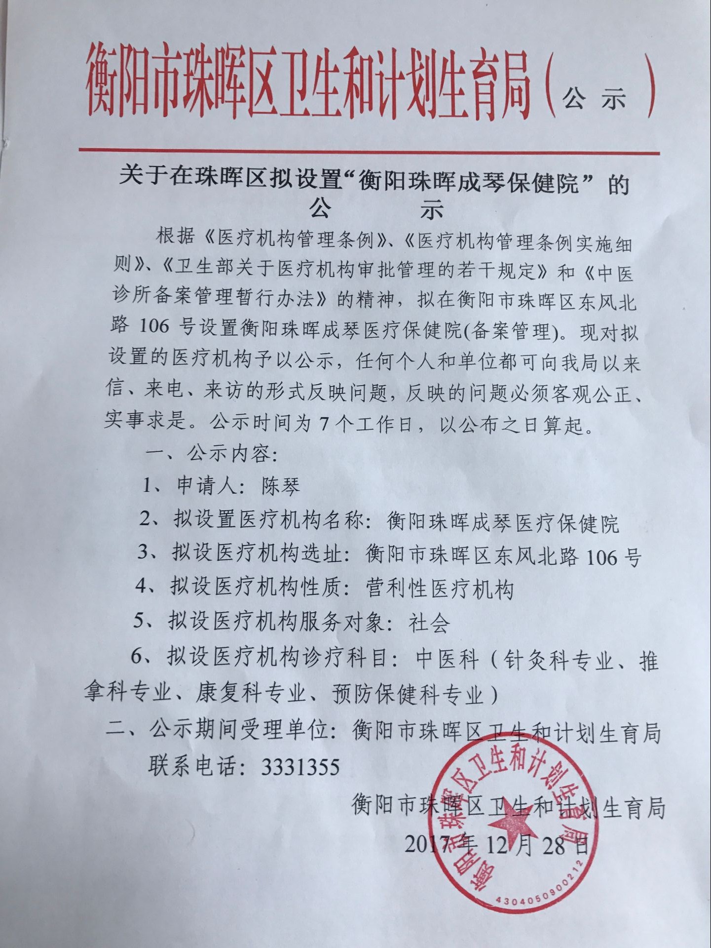 关于在珠晖区拟设置“衡阳珠晖成琴保健院”的公示