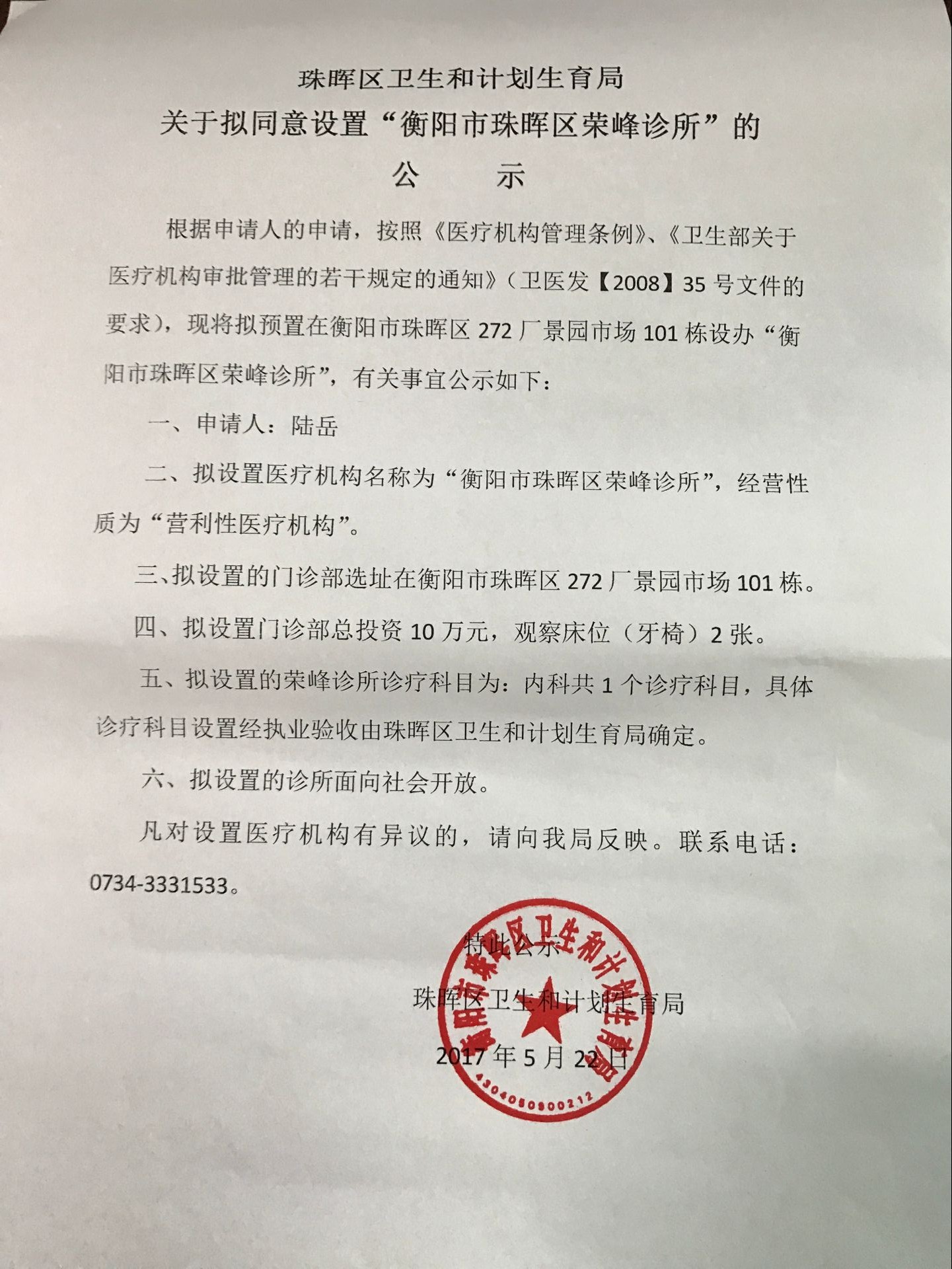 关于拟同意设置“衡阳市珠晖区荣峰诊所”的公示
