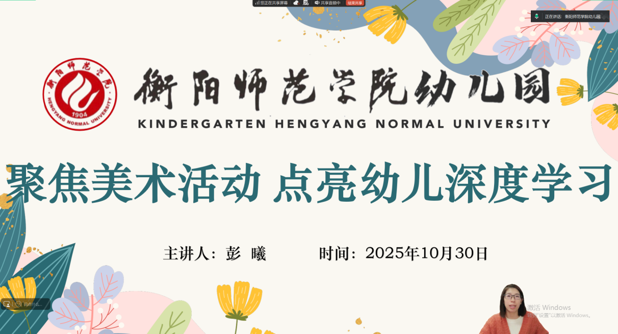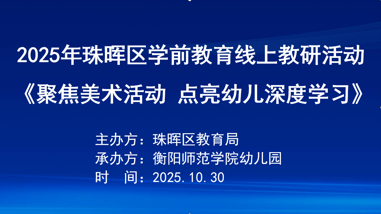 2025年10月30日,由珠晖区教育局主办、衡阳师范学院幼儿园承办的"聚焦美术活动,点亮幼儿深度学习"线上教研活动成功举行。活动通过腾讯会议平台进行直播,吸引了全区近300名幼儿园教师在线参与,共同围绕幼儿美术教育的内涵发展与质量提升进行了深入研讨与交流。