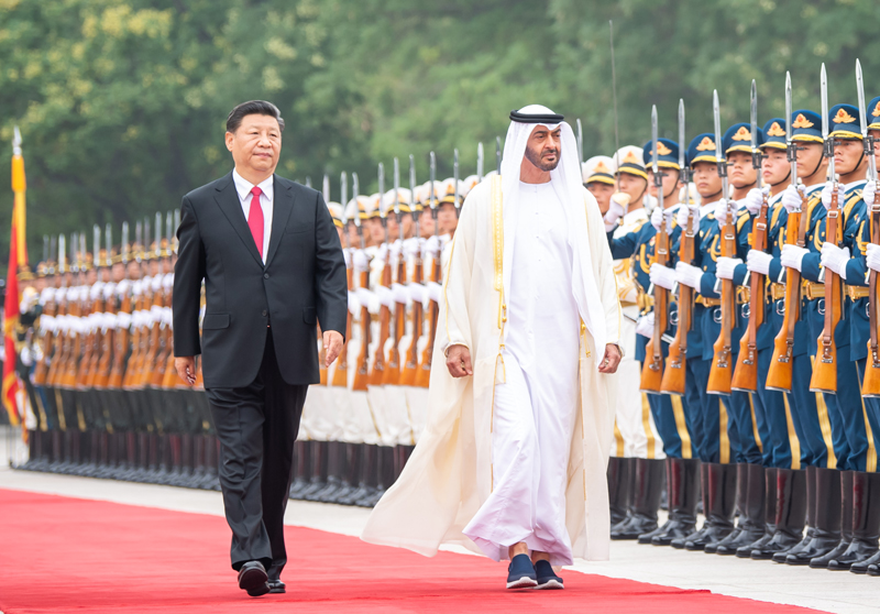 7月22日,国家主席习近平在北京人民大会堂同阿联酋阿布扎比王储穆罕默德举行会谈。这是会谈前,习近平在人民大会堂东门外广场为穆罕默德举行欢迎仪式。新华社记者 翟健岚 摄