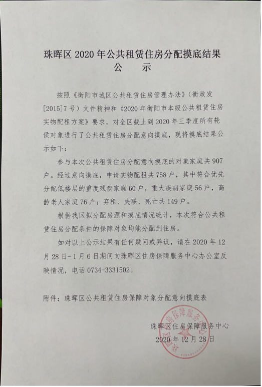 珠晖区2020年公共租赁住房分配摸底结果公示
