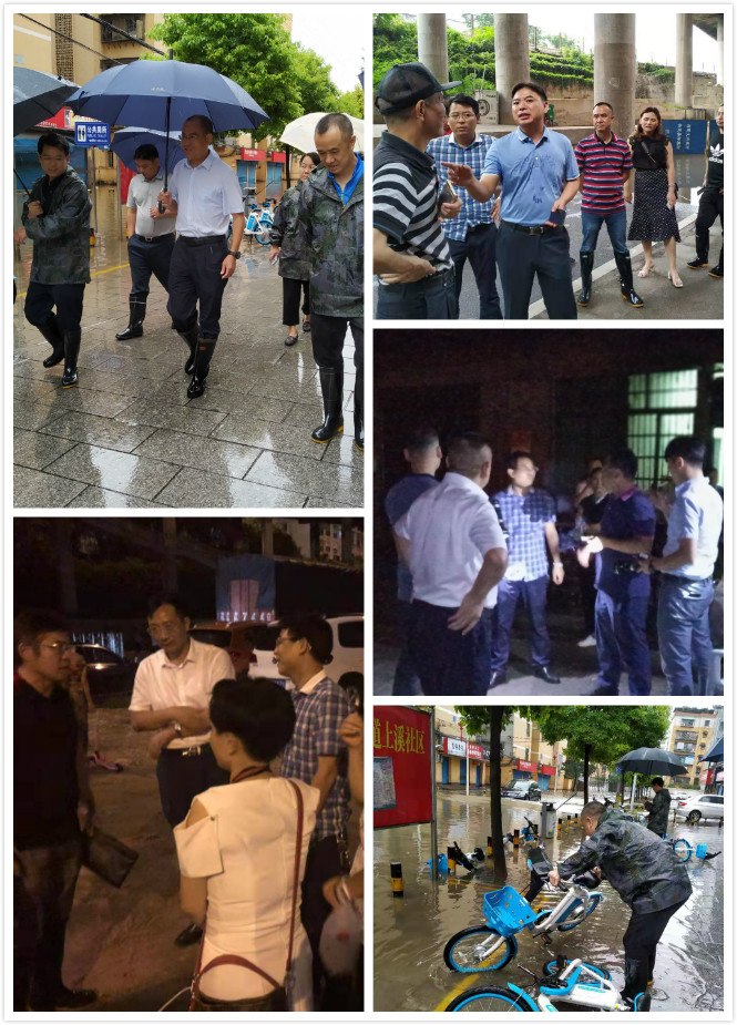 广东路街道党政领导带队,街道及社区干部按照《应对强降雨天气应急预案》的值班安排表自7月6日开始每天进行24小时全天候应急值守,并对辖区内低洼地带、老、旧危房进行巡查,密切关注可能性灾害变化。7月7日早上开始,广东路辖区内低洼地带开始出现不同程度的内涝,汛情就是命令,街道和社区干部主动作为,深入受灾一线,设置安全警示标示,及时了解居民人身及财产安全情况,开展转移受灾群众、排内涝和道路疏通等应急救灾工作。7月9日12时,我市启动了Ⅱ级防汛应急响应,荷花坪内涝点防汛形势严峻,广东路街道全体干部始终坚守防汛救灾一线,疏散居民群众,组织对内涝点进行排水。区委书记陈礼洋、区长刘桢干先后到广东路街道内涝点实地踏查,指导和调度防汛救灾工作。区委常委、区委办主任唐黎明、副区长周爱民、旷善、区人大常委会副主任周定缘等领导多次到内涝点视察,研究解决内涝问题,现场部署具体救灾工作。住建、水利、应急、民政等相关部门各司其职,各负其责。工商、教育等部门也密切配合。广大党员干部在防汛救灾中,主动发挥战斗堡垒和先锋模范作用,坚守在人民群众最需要、灾情最严重的地方,为守卫人民生命财产安全贡献自己的力量。