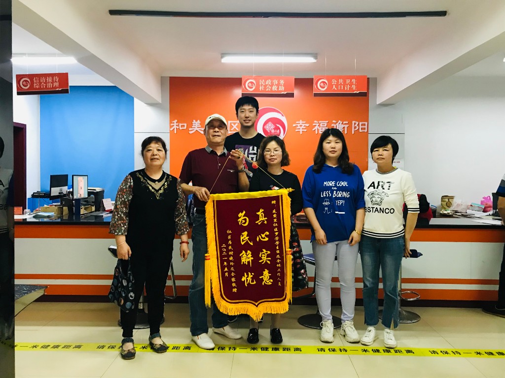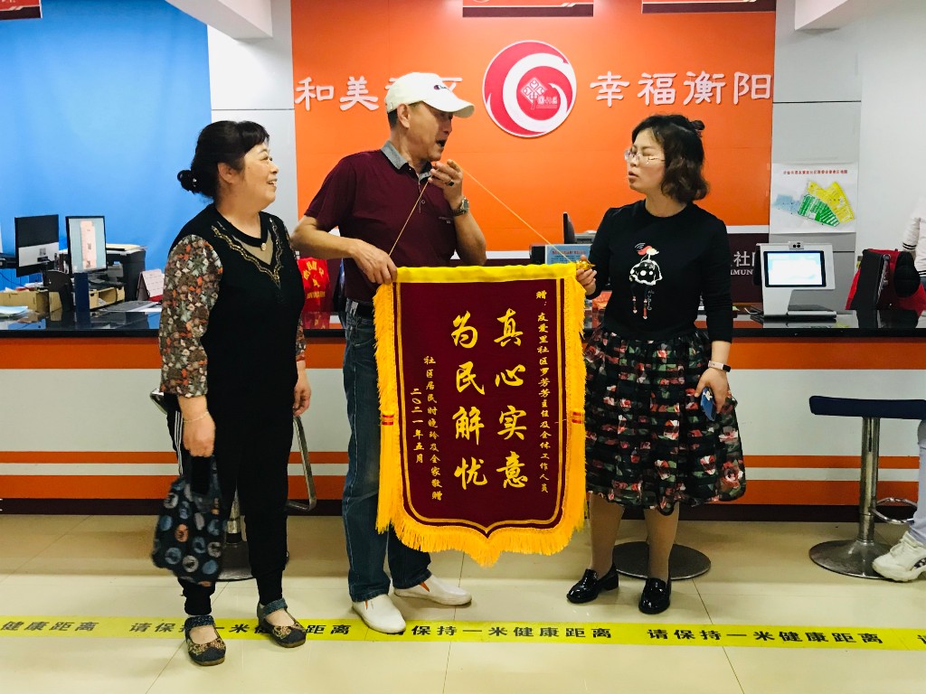 5月6号下午4点左右,在刚结束五一小长假的第一个工作日里,居住在冶金街道龙山里2栋6号302户时晓玲、黄莉玲夫妇笑意盈盈地拿着"为民解忧真心实意"的锦旗走进友爱里社区,热情地和友爱里社区书记说:"罗书记,我特意来谢谢你的,我感谢你不是因为我的医疗补助金到账了,是感谢你的工作态度热心友善,没有一句话把我轰走。让我少跑了好多部门,太感谢你了。"友爱里社区书记不好意思地笑着说:"这都是我们应该做的,您太客气了。"