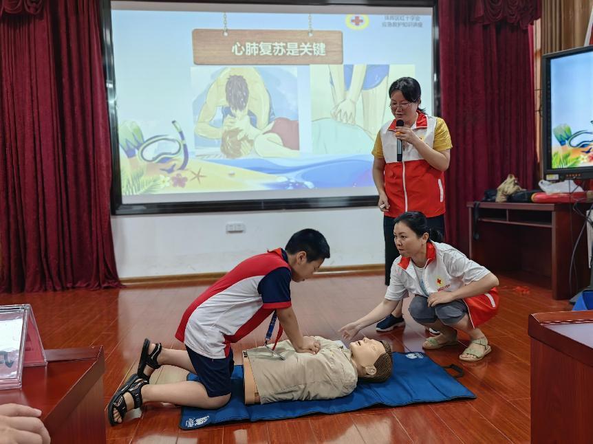 在防溺水安全培训演练中,街道工作人员向孩子们发放了《防溺水告家长书》宣传单,播放了防溺水警示教育片,区红十字会工作人员通过理论讲解、现场演示、学生参与、解疑答问等方式,介绍了溺水及应急救援常识,讲解传授了学生救生衣、救援绳等不同救援器具的使用方法,以及正确的施救方式、溺水自救、心肺复苏操作要领等。整个活动过程,孩子们积极参与互动,活动现场氛围浓烈。