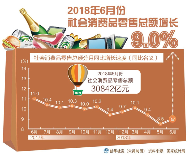 图表:2018年6月份社会消费品零售总额增长9.0%