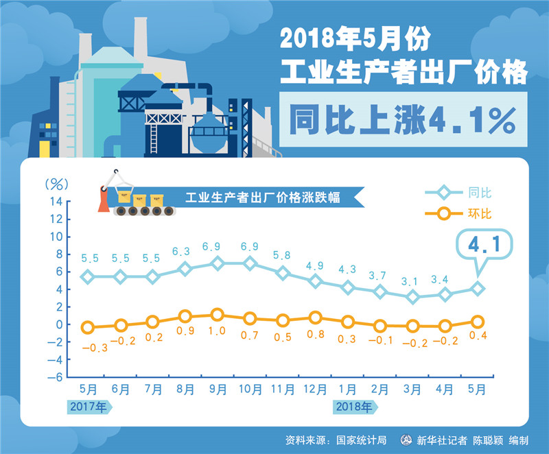 图表:2018年5月份工业生产者出厂价格同比上涨4.1%
