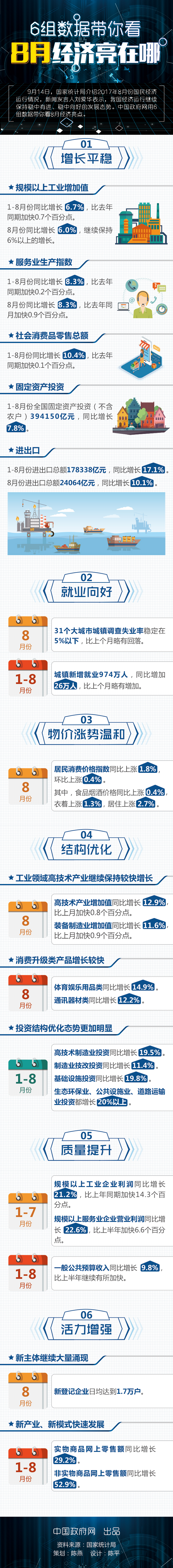 9月14日,国家统计局介绍2017年8月份国民经济运行情况,新闻发言人刘爱华表示,我国经济运行继续保持稳中有进、稳中向好的发展态势。中国政府网用6组数据带你看8月经济亮点。